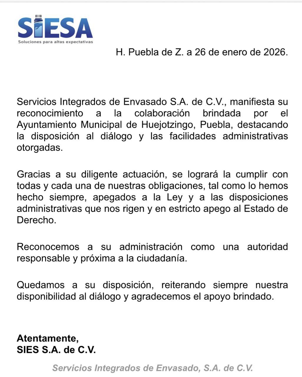 El Gobierno Municipal de Huejotzingo, encabezado por el Presidente Municipal Roberto Solís Valles, informa que la empresa con razón social Servicios Integrados de Envasado S.A. de C.V. (SIESA) ha mostrado plena disposición para colaborar y cumplir con los requerimientos legales y administrativos que le permitan regularizar su situación.